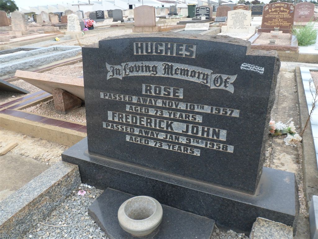 • Fred & Rose Hughes: Headstone, 1958, Dudley Park Cemetery, Adelaide. (Image Courtesy of Ancestry/Rootsweb) Rose married Frederick John HUGHES [263] [MRIN: 69], son of Joseph Prentice HUGHES [266] and Mary RYDER [267], on 15 Apr 1914 in Methodist Parsonage, Lefevre Tce, Nth Adelaide, South Australia. (Frederick John HUGHES [263] was born on 20 Dec 1884 in North Adelaide, South Australia, died on 9 Jan 1958 in Prospect, Adelaide, South Australia and was buried in Dudley Park Cemetery, Adelaide, South Australia.)