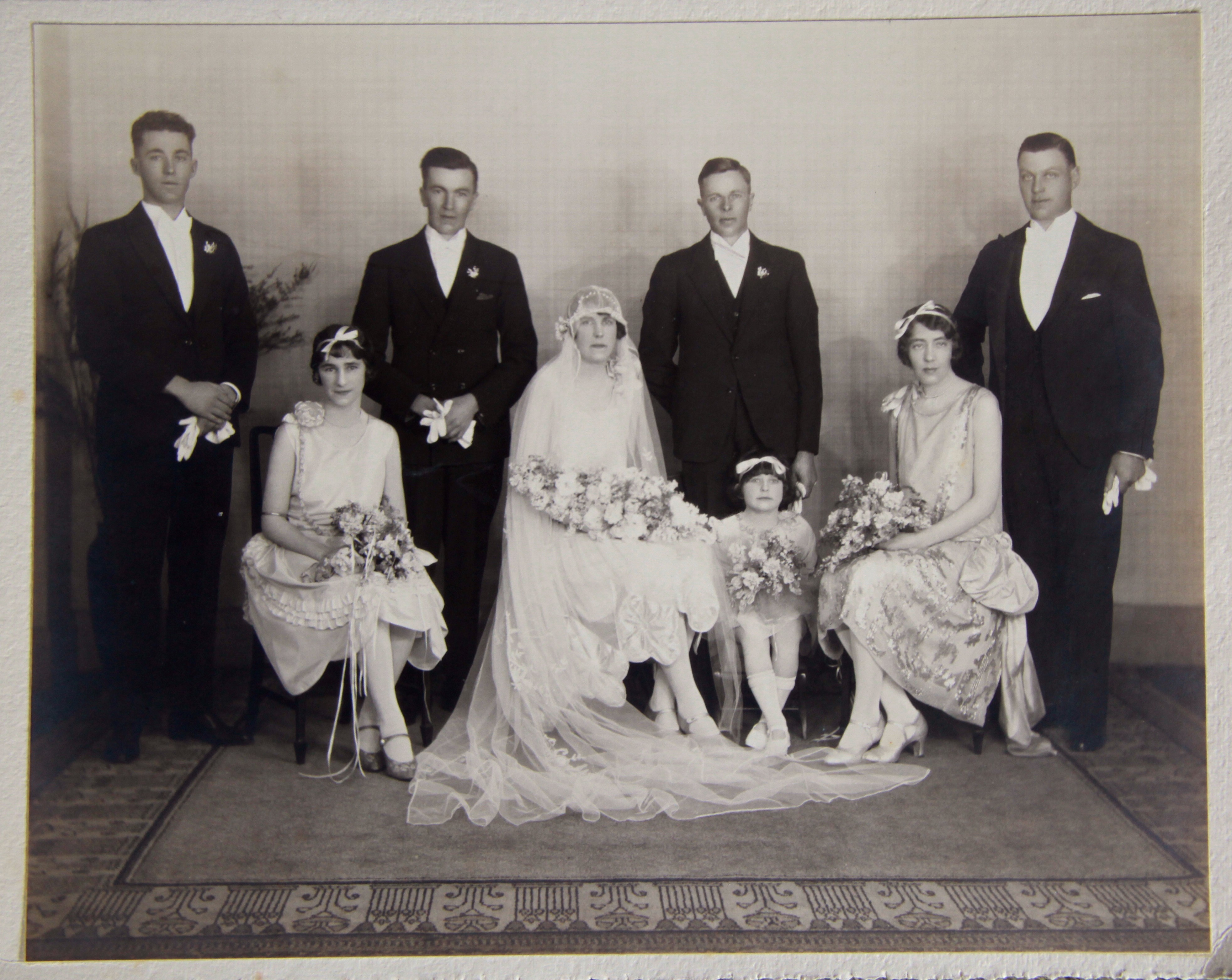 • Photograph: Wedding, 1928, Archer Street Methodist Church, North Adelaide. Ronald Hughes, Kenneth Caldicott, George Caldicott, Wm James Hughes, unknown, Dorothy Caldicott, Iva Bridgeland and Donna Clisby(8y) Dot married George Sandars CALDICOTT [61] [MRIN: 2], son of Henry George CALDICOTT [62] and Harriet Mary FRY [63], on 22 Aug 1928 in Methodist Church, Archer St, North Adelaide, South Australia. (George Sandars CALDICOTT [61] was born on 1 Aug 1897 in Forest Range, nr Nairne, South Australia, died on 21 Feb 1975 in Adelaide, South Australia and was buried on 25 Feb 1975 in Norton Summit Cemetery, South Australia.) |