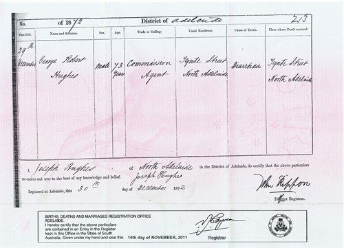 • George Robert Hughes: Death Certificate, 1872, Tynte st, North Adelaide.
