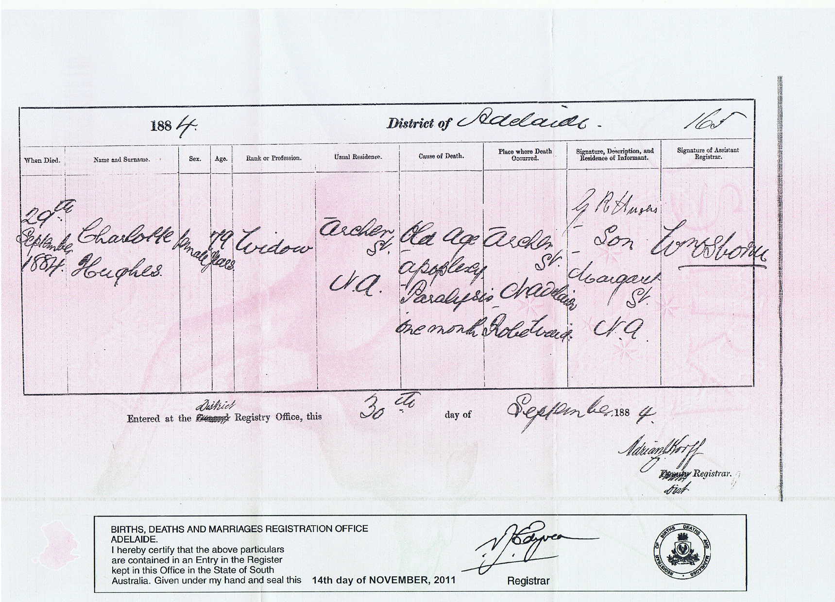 • Charlotte Hughes: Death Certificate, 1884, Adelaide, South Australia. Charlotte married George Robert HUGHES [236] [MRIN: 82], son of James HUGHES [2580] and Mary COLSHAW [2581], on 15 May 1826 in St Peter, Leeds, Yorkshire, England. (George Robert HUGHES [236] was born on 6 Aug 1800 in Leeds, YKS, England, baptised on 28 Sep 1800 in St Peter, Leeds, Yorkshire, England, died on 29 Dec 1872 in Tynte Street, North Adelaide, South Australia and was buried on 31 Dec 1872 in Walkerville Cemetery, South Australia.). The cause of his death was diarrhoea.