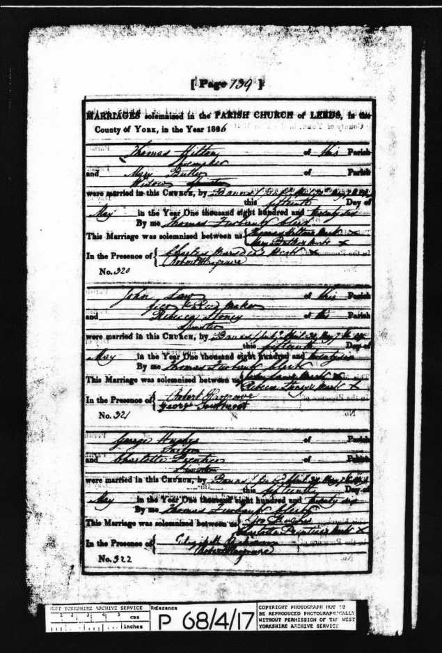 • Marriage, 15 May 1826, St Peter, Leeds, Yorkshire, England. Parish Register St Peter Leeds