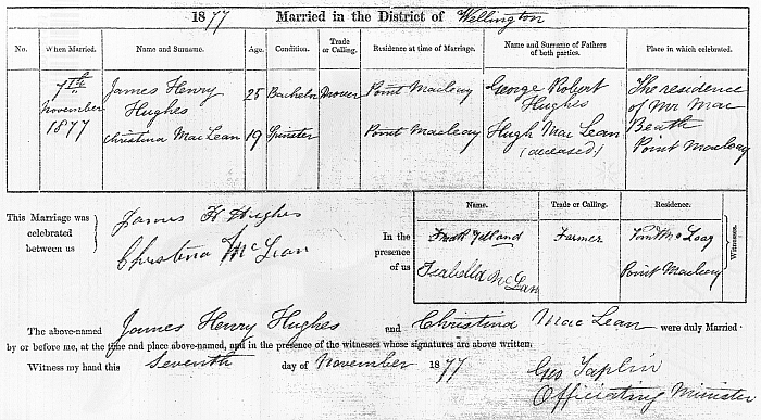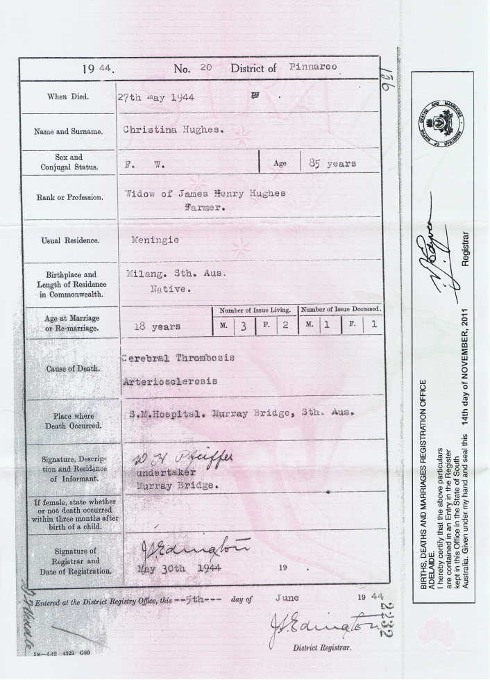 • Image: Death Certificate, 1944, Murray Bridge, South Australia. (Image courtesy Sorensen Family Tree/Ancestry) Christina married James Henry HUGHES [288] [MRIN: 97], son of George Robert HUGHES [236] and Charlotte PRENTICE/PRENTIS [238], on 7 Nov 1877 in Res of Mr MacBeath, Point Macleay, South Australia. (James Henry HUGHES [288] was born on 11 Jun 1853 in Nairne, South Australia, died on 4 Nov 1920 in Albert Hill, nr Meningie, South Australia and was buried on 5 Nov 1920 in Meningie, South Australia.)