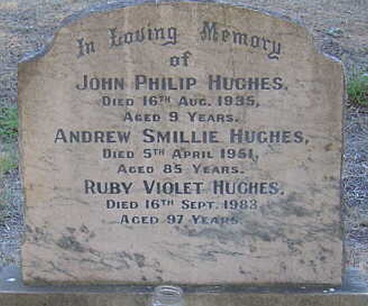 The Advertiser Friday 6 April 1951 Death Notice: HUGHES.- On April 5, at Woodside, Andrew Smillie, dearly loved husband of Ruby and loving father of Richard and Elizabeth, also Philip (deceased). Aged 80 years.