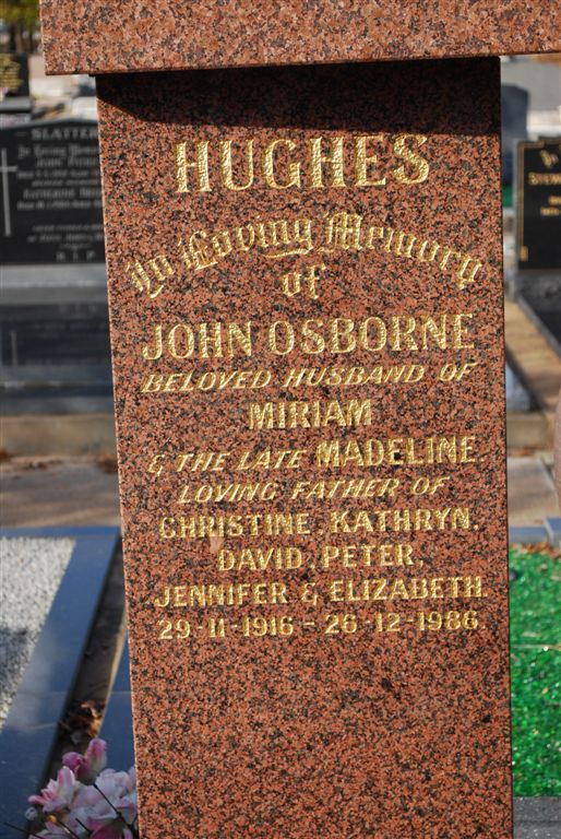 The Advertiser (Adelaide) Monday 29 December 1986 Death Notices: HUGHES, John Osborne. - On December 26 at his residence, dearly beloved husband of Miriam and the late Madeline, loving father of Christine, Kathryn, David, Peter, Jennifer and Elizabeth, dear grandpa of eight grandchildren. Aged 70 years. Rest in peace.