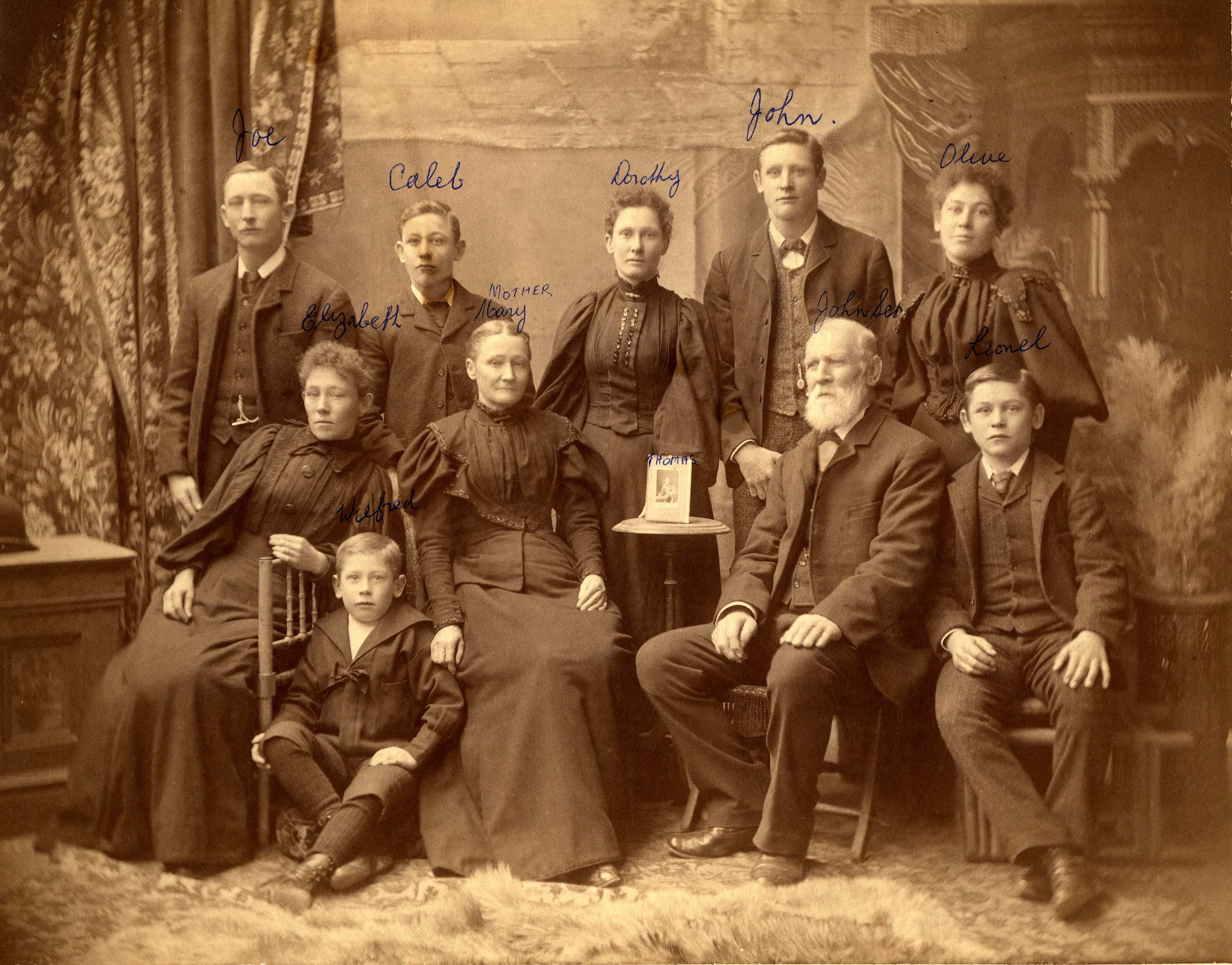 • John5 & Mary: Family, 1897. (Image Courtesy S L Bails) As marked: Joe, Caleb, Dorothy, John, Olive, Elizabeth, Mary (photo: Thomas) John5, Lionel & Wilfred