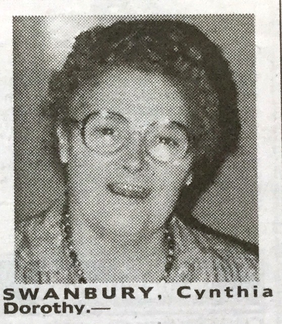 The Advertiser Adelaide) Friday 8 February 2008 Death Notice: SWANBURY, Cynthia Dorothy. -- Deepest sympathy to Bob, John, and Kay (deceased) on the passing of their beloved mother. In God's Care. Love from Sheryl, Jo, Justin and Kelly, Levi and Evelyn, Batty, Laurie and families.