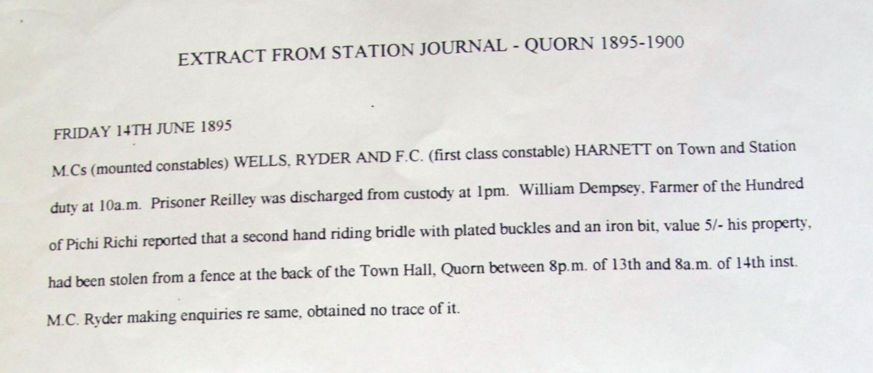 Extract from [Police]Station Journal - Quorn 1895-1900 Friday 14th June 1895 M.Cs (mounted constables) WELLS, RYDER AND F.C. (first class constable) HARNETT on Town and Station duty at 10a.m. Prisoner Reilley was discharged from custody at 1pm. William Dempsey, Farmer of the Hundred of Pichi Richi reported that a second hand riding bridle with plated buckles and an iron bit, value 5/- his property, had been stolen from a fence at the back of the Town Hall, Quorn between 8p.m. of 13th and 8a.m. of 14th inst. M.C. Ryder making enquiries re same, obtained no trace of it.