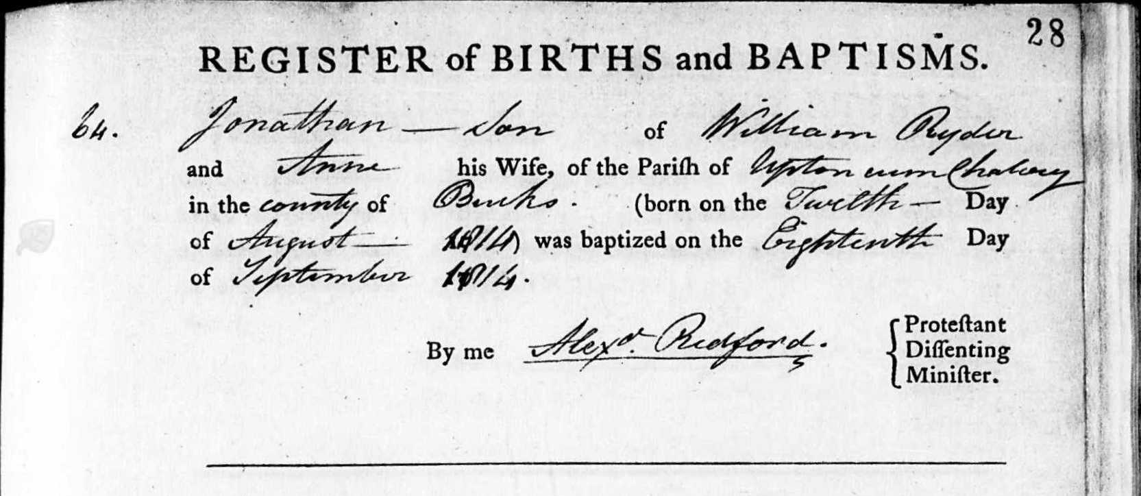 England & Wales Non Conformist Record Index Name: Jonathan Ryder Event Type: Baptism Christening Date: 18 Sep 1814 Christening Place: Windsor, Berkshire Father's Name: William Ryder Mother's Name: Anne Ryder Affiliate Publication Number: RG4_0290