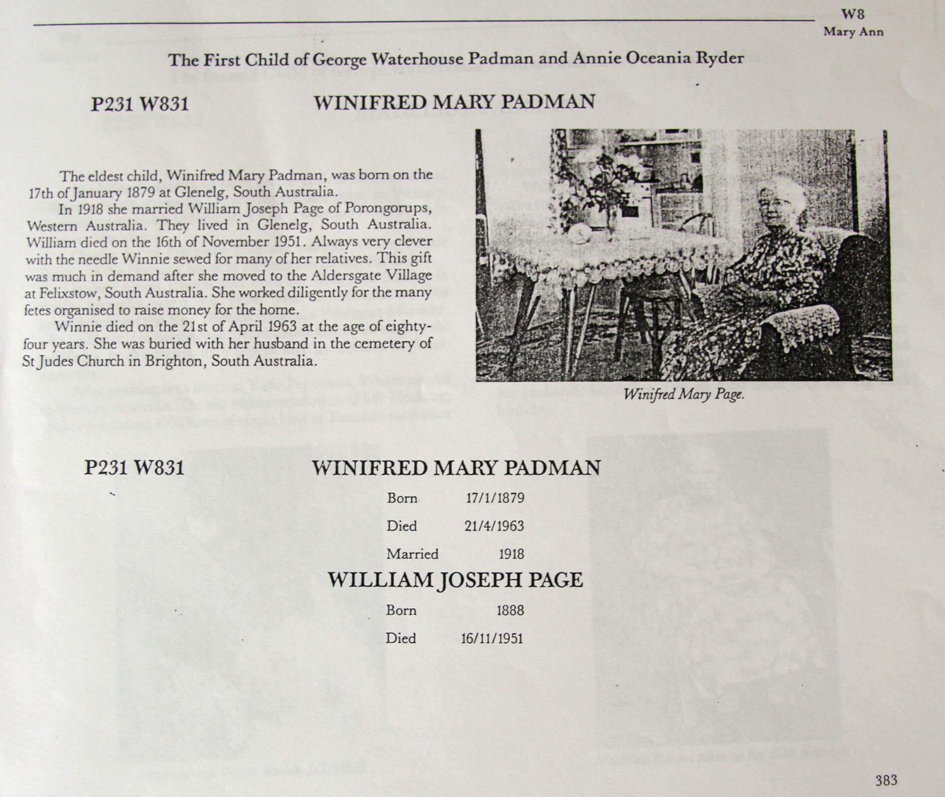 Winnie married William Joseph PAGE [535] [MRIN: 182], son of James Elijah PAGE [4151] and Louisa Ellen WARE [4152], on 11 Apr 1918 in Tammin, Western Australia. (William Joseph PAGE [535] was born in 1888 in Porongurups, Western Australia, died on 16 Nov 1951 in Flying from Perth to Adelaide and was buried on 19 Nov 1951 in St Jude's Cemetery, Brighton, South Australia.)