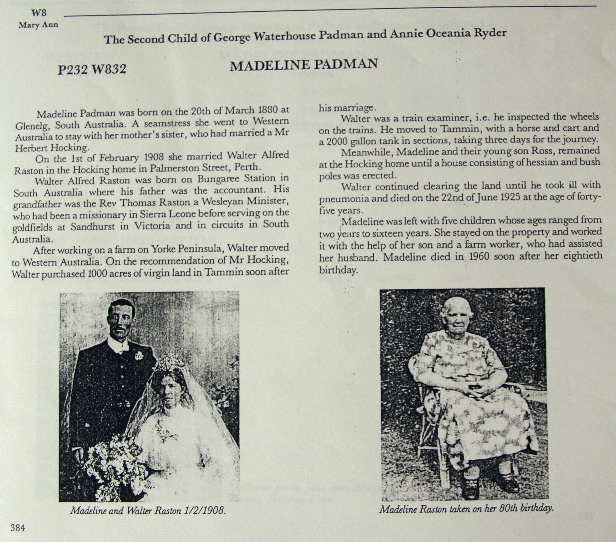 • Residence: Son Thomas's engagement, 1938, 29 Goldsmith road, Claremont, Perth WA. • Australian Electoral Roll 1903-1980: home duties, 1943, Ecclefechan, Tammin, Western Australia. (Annie May Raston) May married Walter Alfred RASTON [1641] [MRIN: 542], son of Edward Alfred RASTON [5156] and Ermina Henrietta JAMES [5157], on 1 Feb 1908 in 82 Palmerston Street, Perth, West Australia. (Walter Alfred RASTON [1641] was born on 20 Nov 1879 in Adelaide, South Australia and died on 22 Jun 1925 in Tammin, Western Australia.)