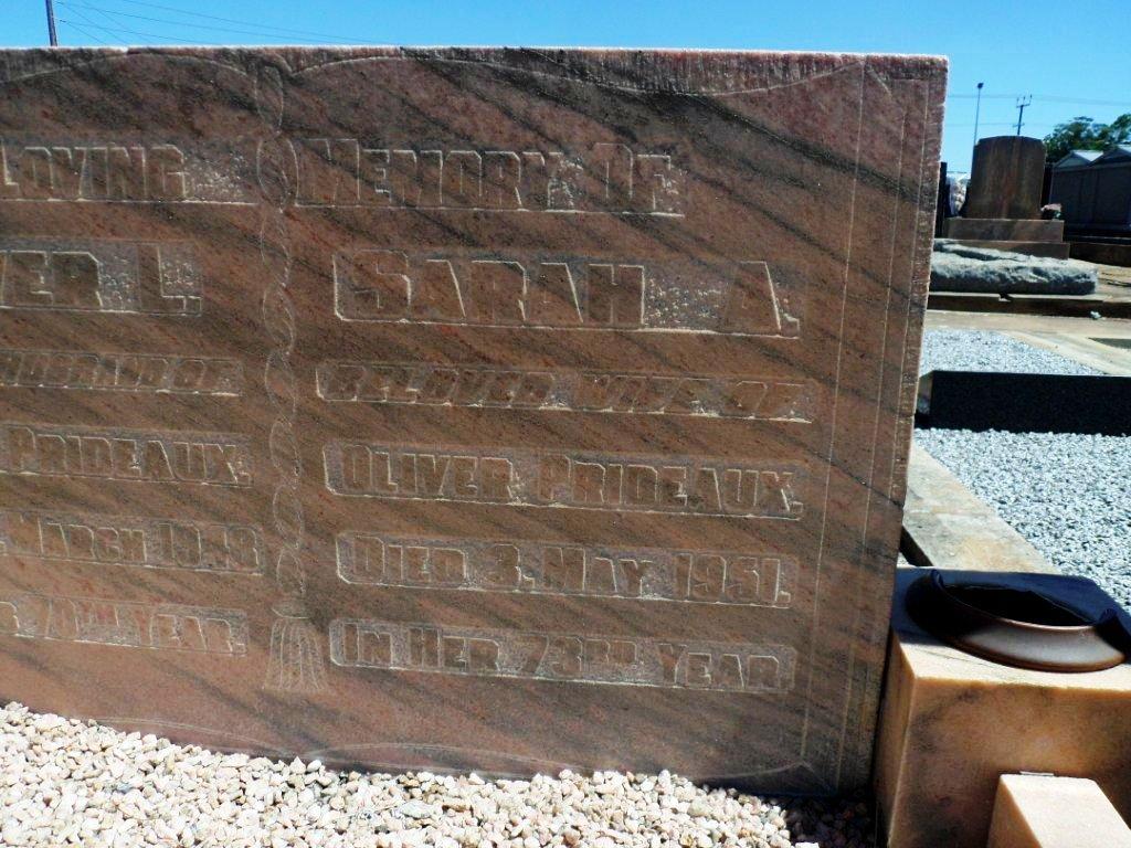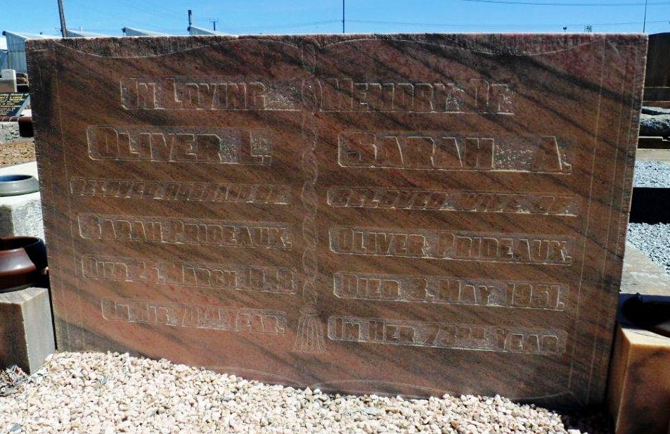 Dudley Park Cemetery: PRIDEAUX Oliver L 70y 1948; Relations: Husband of Sarah A; PRIDEAUX OLIVER L 1948 AGE 70, SARAH A 1951 AGE 73 1764 3