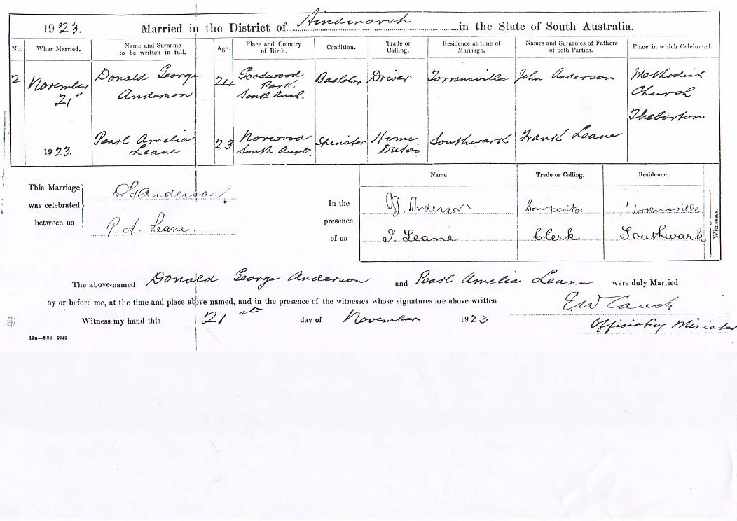 Oliver married Sarah Ann BOYCE [7537], daughter of George BOYCE [7538] and Sarah HARLAN [7539], on 4 Oct 1905 in Res of brides mother Yorketown, South Australia. Sarah was born on 9 Sep 1877 in Yorktown, South Australia, died on 3 May 1951 in Kilburn, Adelaide, South Australia at age 73, and was buried in Dudley Park Cemetery, Adelaide, South Australia.