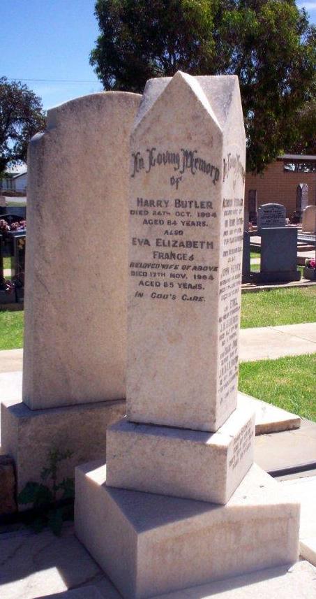 90. Albert William PRIDEAUX [2725] (Mary BROADBENT25, Eliza LEWIS10, Joseph5, Peter2, Peter1) was born on 4 Sep 1874 in Wallaroo Mines, South Australia, died on 30 Sep 1939 in Kelmscott, Adelaide, South Australia at age 65, and was buried in Cheltenham Cemetery, South Australia.