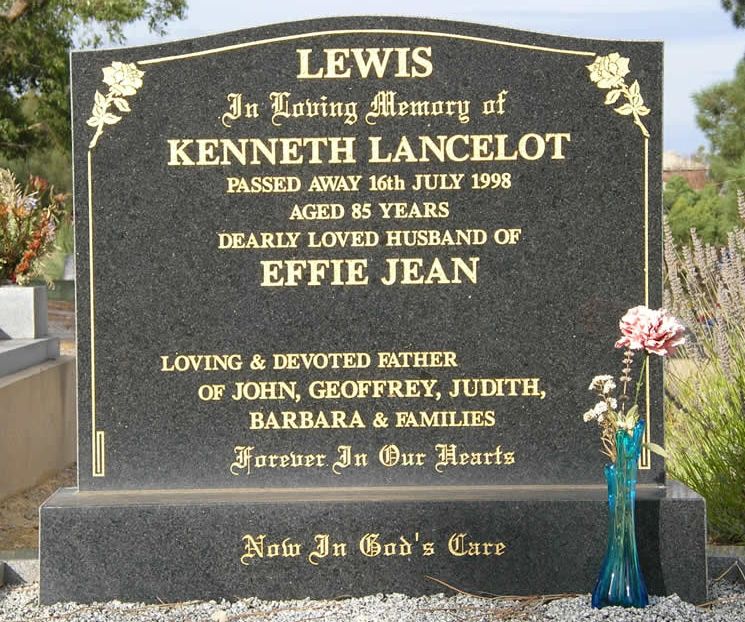 Scott Creek Cemetery: LEWIS Kenneth 32y 1967; Husband of Kath, father of Barry, Phillip & Carolyn.