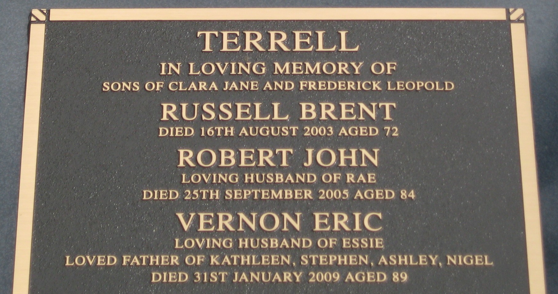 + 240 M ii. Allen Llewellyn PRIDEAUX [7593] was born on 6 Mar 1908 in Yorktown, South Australia, died on 25 Apr 1986 in South Australia at age 78, and was buried on 28 Apr 1986 in Dudley Park Cemetery, Adelaide, South Australia.