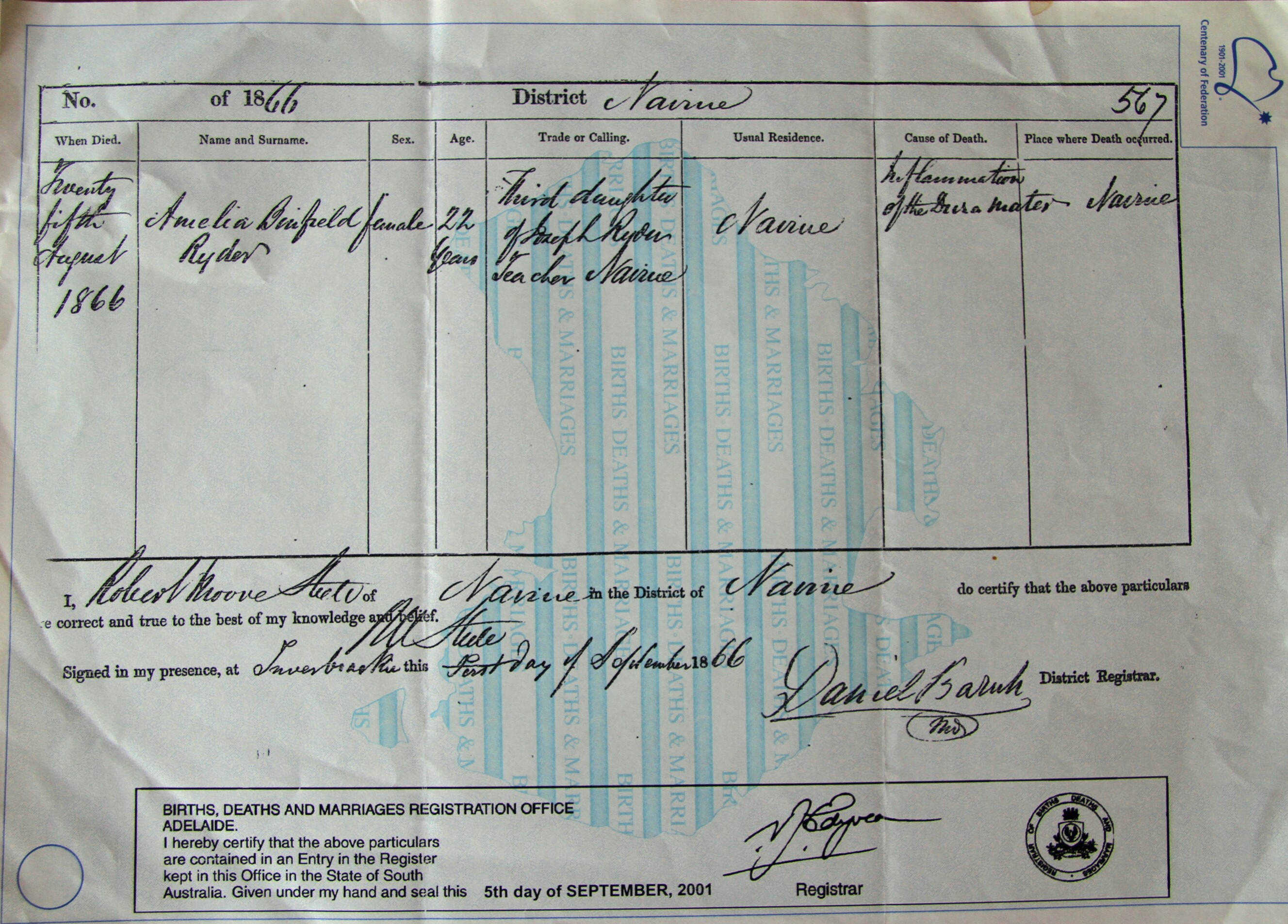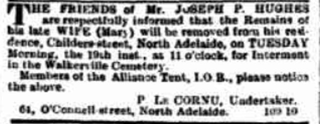 14. Mary Ann TILLEY [2921] (Mary RYDER8, William6, Thomas2, William1) was born on 2 Mar 1839 in Berkshire, England and died on 29 Jul 1908 in Adelaide, South Australia at age 69.