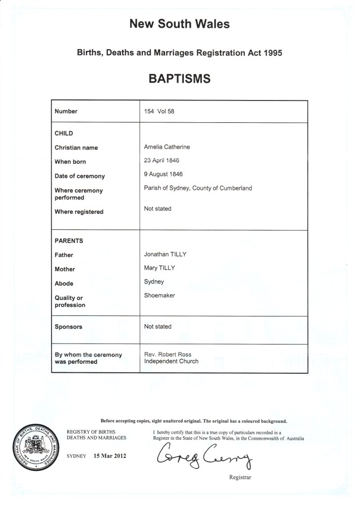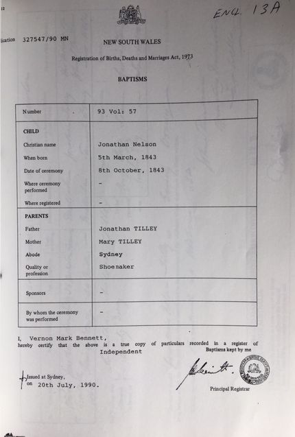 1843 NSW Birth (Baptism) V184393 57 TILLEY JONATHAN N, JONATHAN, MARY (Image courtesy of P Tilley 2016)