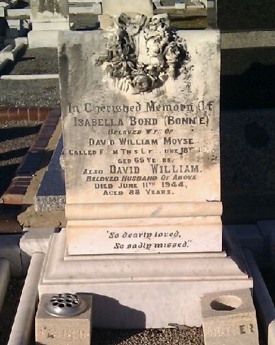 Bonnie married David William MOYSE [933], son of William MOYSE [378] and Jane SNELL [3709], on 19 Feb 1881 in Res of Joseph Ryder, Windsor, South Australia. David was born about 1856 in Menheniot, Cornwall, England, died on 12 Jun 1944 in North Adelaide, South Australia aged about 88, and was buried on 14 Jun 1944 in Payneham Cemetery, Adelaide.