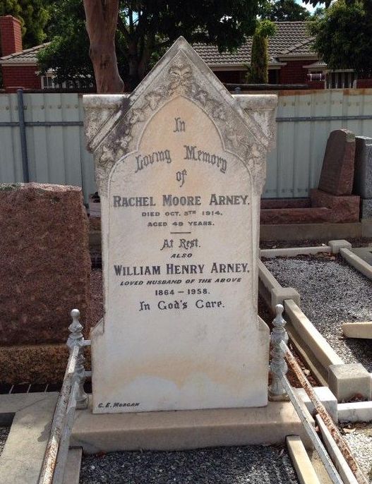 • Cemetery: Headstone, 1914, Payneham Cemetery, Adelaide. Rachel married William Henry ARNEY [160] [MRIN: 598], son of William Henry ARNEY [1755] and Hannah AXFORD [1756], on 18 Mar 1891 in Res of Noble J W Lindsay, Oldbury Farm, Dublin, South Australia. (William Henry ARNEY [160] was born on 18 Jun 1864 in nr Woodside, South Australia, died on 2 Mar 1958 in Adelaide, South Australia and was buried in Evergreen Memorial Cemetery, Enfield, South Australia.)