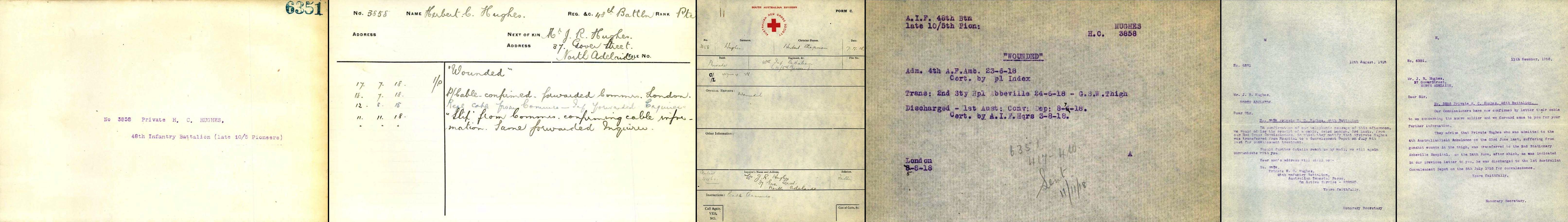 The AIF Project - WWI Name: Herbert Chapman Hughes Regimental number: 3858 Religion: Methodist Occupation: Farmer Address: Yumali, South Australian Marital status: Single Age at embarkation: 25 Next of kin Father, J R Hughes, Vine Street, Prospect, South Australian Enlistment date: 13 July 1917 Rank on enlistment: Private Unit name: 5th Pioneer Battalion, Reinforcement 10 AWM Embarkation Roll number: 14/17/4 Embarkation details: Unit embarked from Melbourne, Victoria, on board HMAT A60 Aeneas on 30 October 1917 Rank from Nominal Roll: Private Unit from Nominal Roll: 48th Battalion Fate: Returned to Australia 8 September 1919
