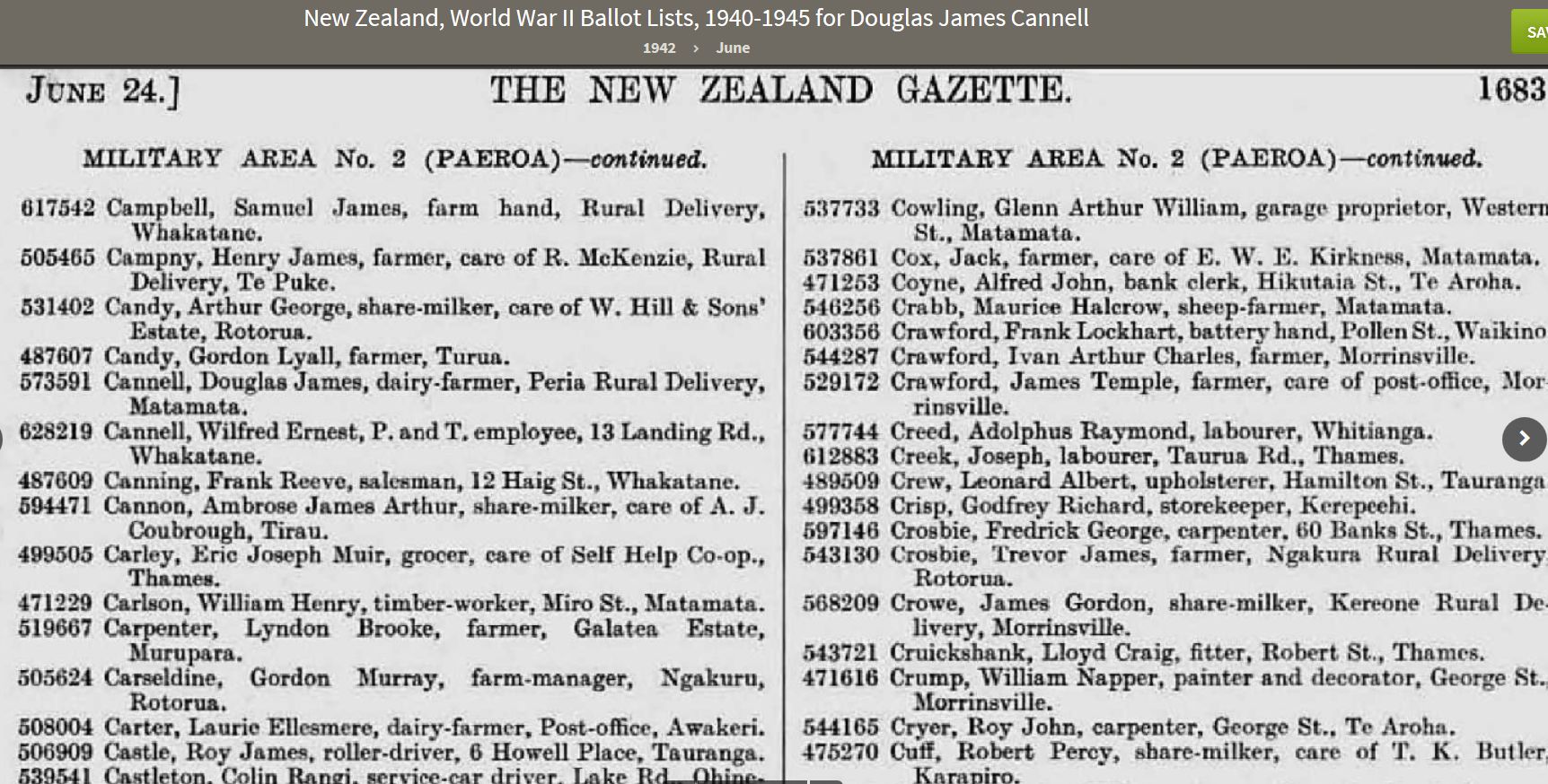 • NZ World War II Ballot Lists 1940-1945: dairy-farmer, 1942, Peria R.D., Matamata. • NZ Electoral Rolls 1853-1981: farmer, 1946, Putaruru, New Zealand.