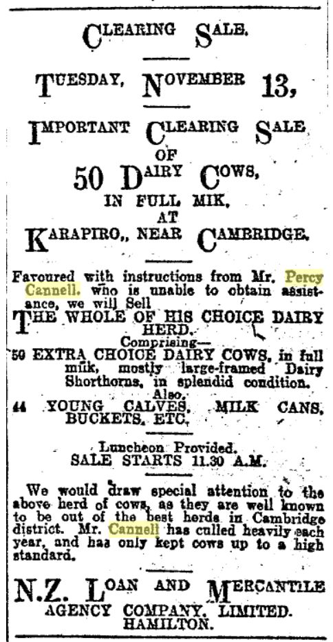 Archives NZ - Archway Probate Indexes Name: Cannell Percy Place: Matamata Court: Hamilton Agency: BCDG Series: 4420 Accession: Box Number: Box 310 Record Number: 7197 Part Number: Item code: 6878468 Filing Years: 1947-1947 Occupation: Farmer Comment: Further enquiries to Archives New Zealand