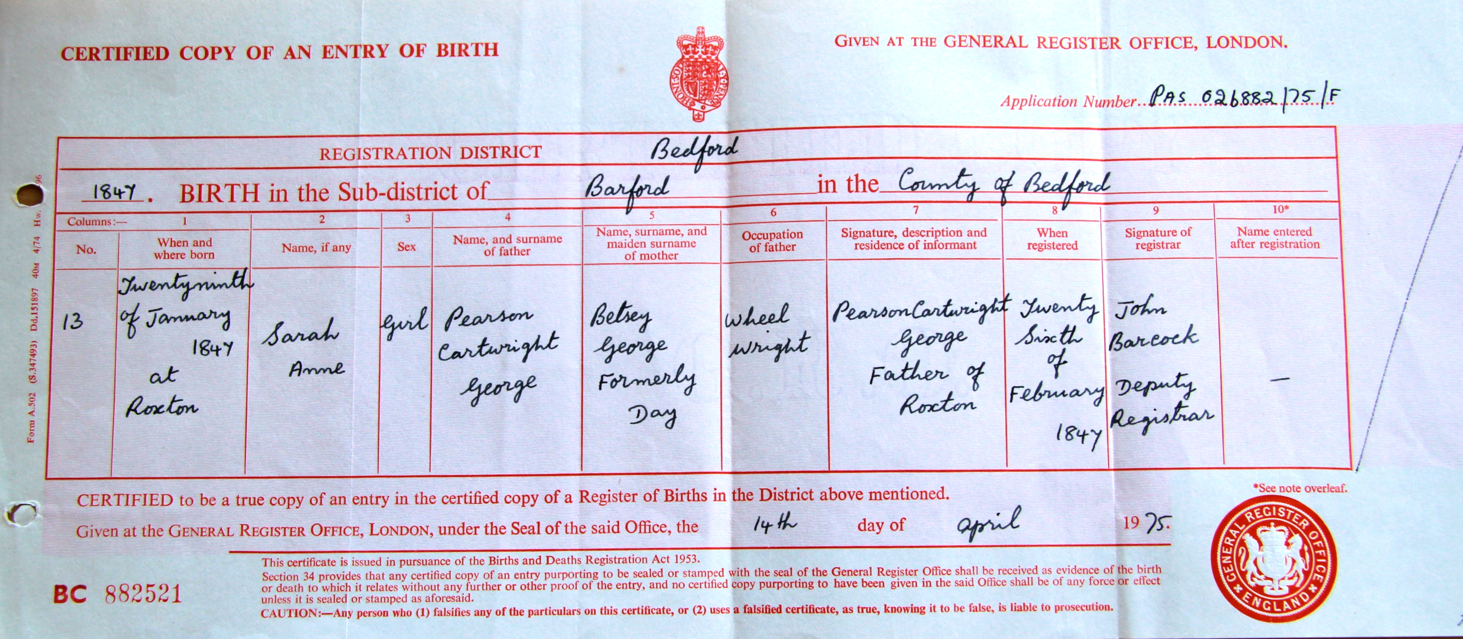 • Birth Certificate: Certified copy, 1847, Roxton, Bedfordshire, England. (dated 1975)