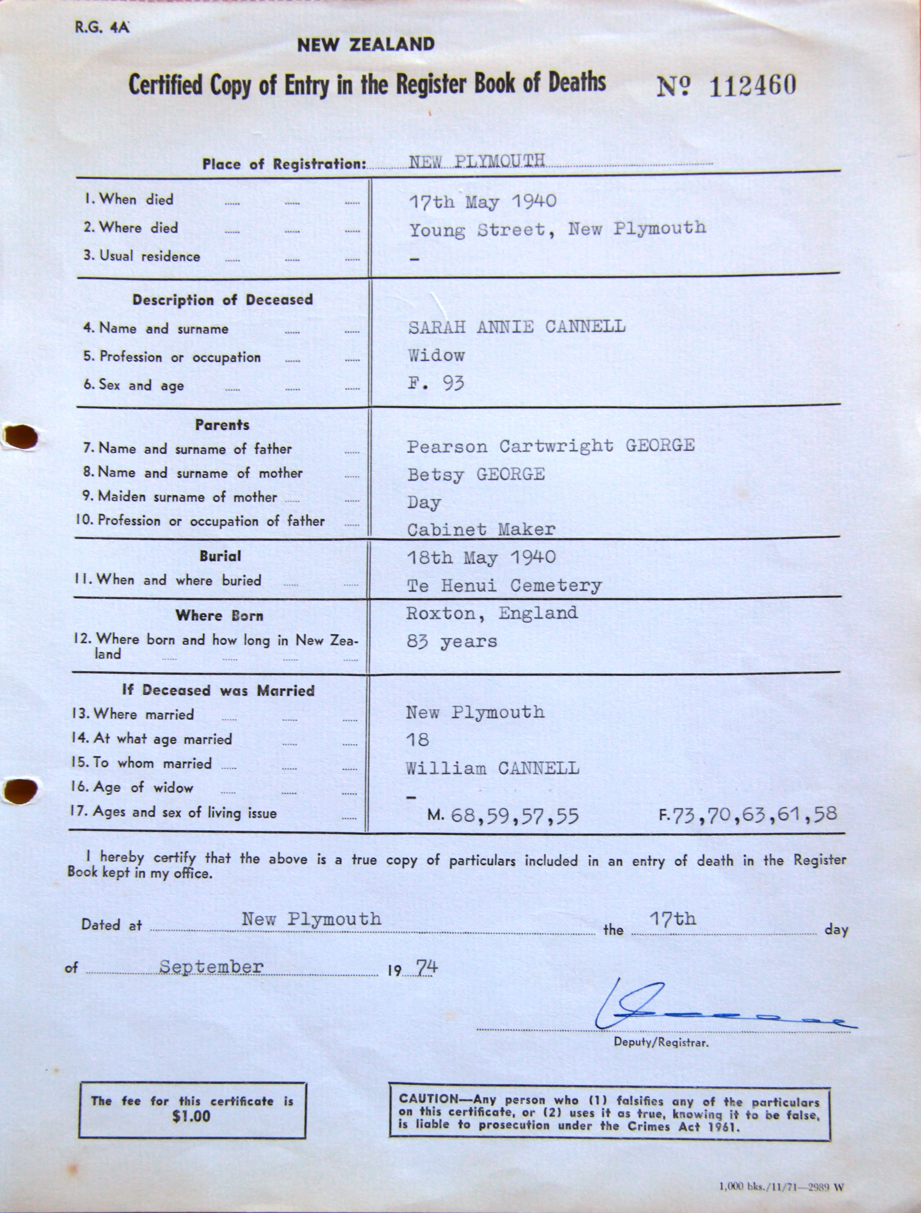 • Death Certificate: Certified copy, 1940, New Plymouth, New Zealand. (Image courtesy C Cannell) (doc dated 1974)