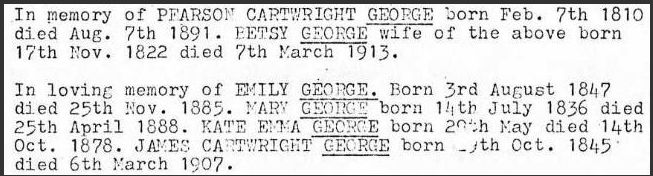 Headstone: In memory of Pearson Carrtwright GEORGE born Feb. 7th 1810 died Aug. 7th 1891. Betsy GEORGE wife of the above born 17th Nov 1822 died 7th March 1913.