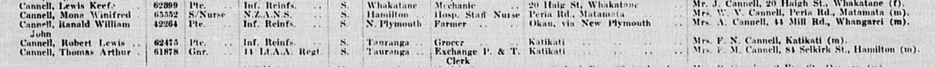 New Zealand Army WWII Nominal Rolls, 1939-1948 Name:Mona Winifred Cannell Embarkation:1941 Army Number: 65532 Last Residence: Peria Rd., Matamata, New Zealand Relative Name: Mrs W V Cannell Relationship:Mother Nominal Roll:1 Apr 1941 - 30 Jun 1941