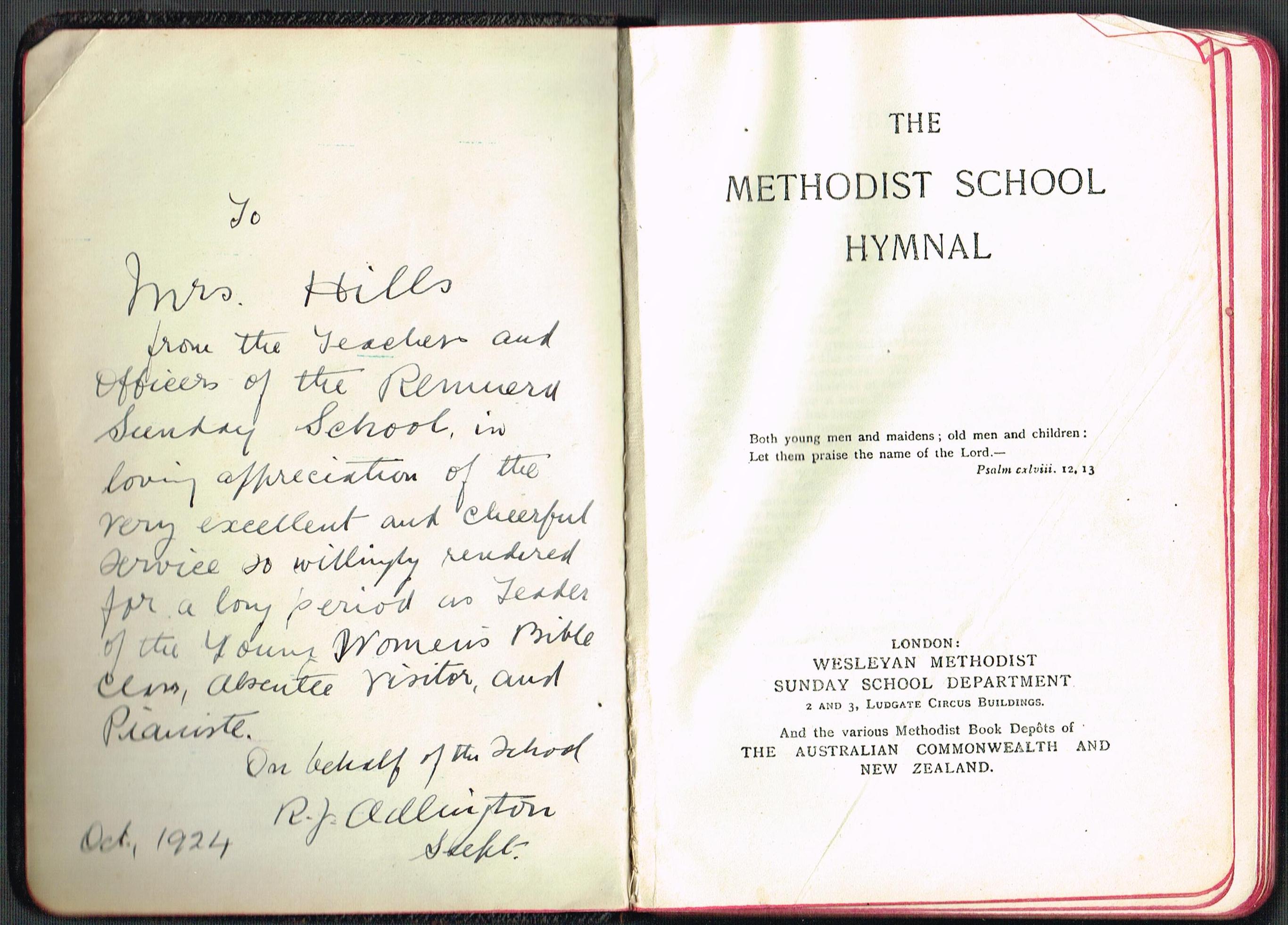 • Winifred Mona Hills (nee Cannell): Methodist School Hymnal - Inscription 1924.