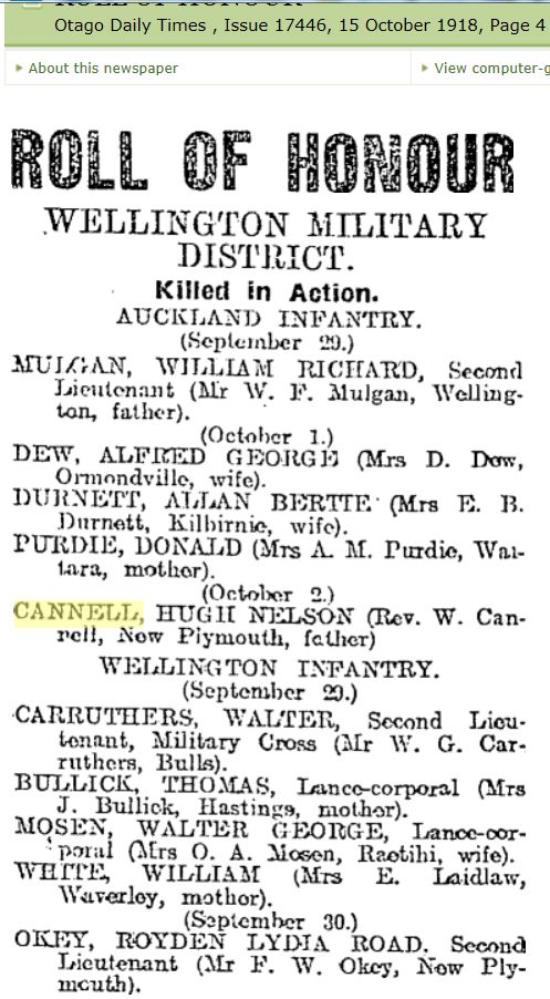 WW1 Deaths 1914-1921 Name: CANNELL Hugh Nelson Date: 2 Oct 1918 Reference: 31165 Rank: Private Force: WIR Fate: KIA Place: France Relation: Son of the Rev. W. and Mrs. Cannell, of Young St., New Plymouth, New Zealand; husband of Mrs. B.M.P. Cannell, of 69, Freyberg St., Wellington, New Zealand. Cemetery: FLESQUIERES HILL BRITISH CEMETERY? Commonwealth WGC Ref