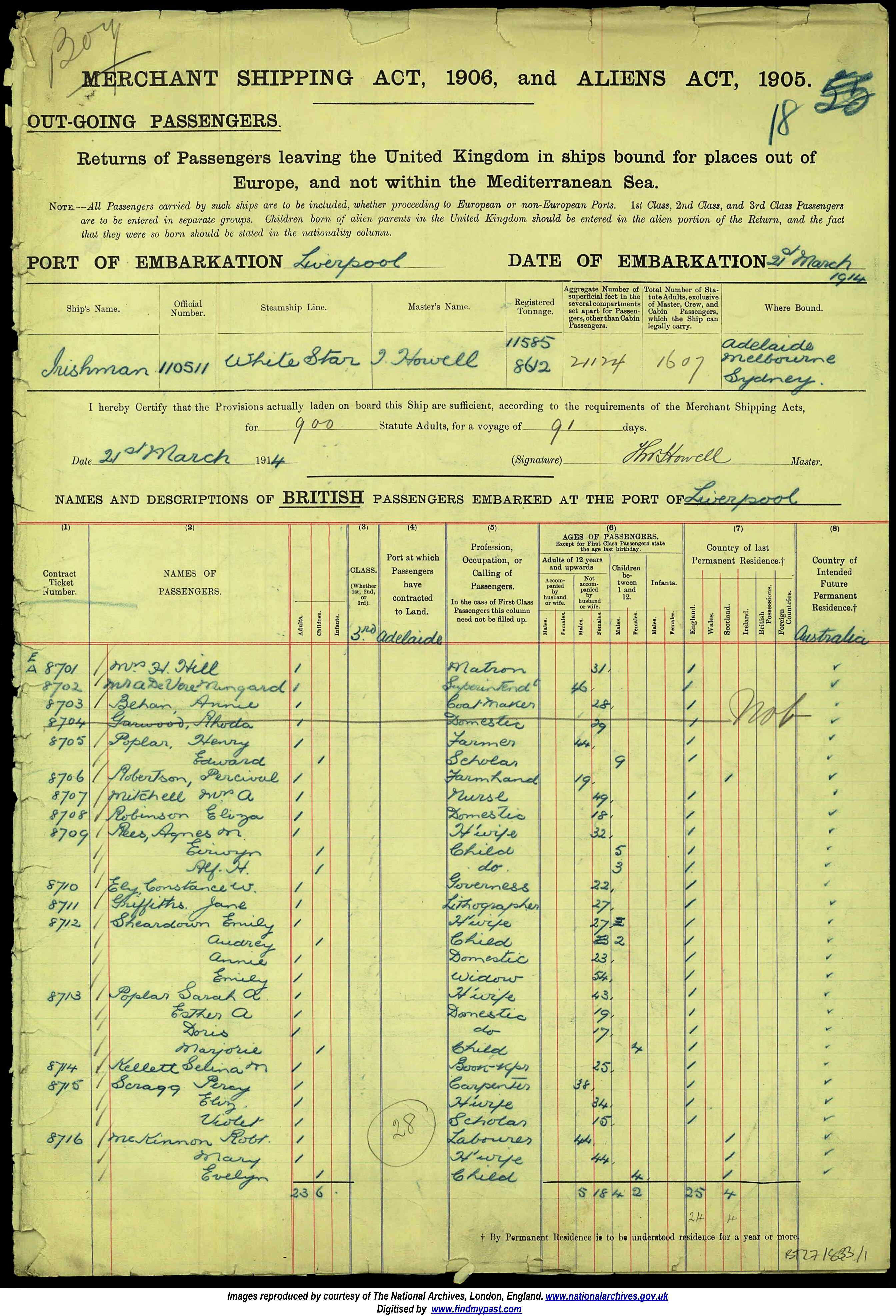 Percy (38y) departed Liverpool, England on 21 Mar 1914 on Irishman of White Star Line and emigrated to Adelaide South Australia. He arrived on the Irishman with wife Elizabeth (34y) and daughter Violet (15y).