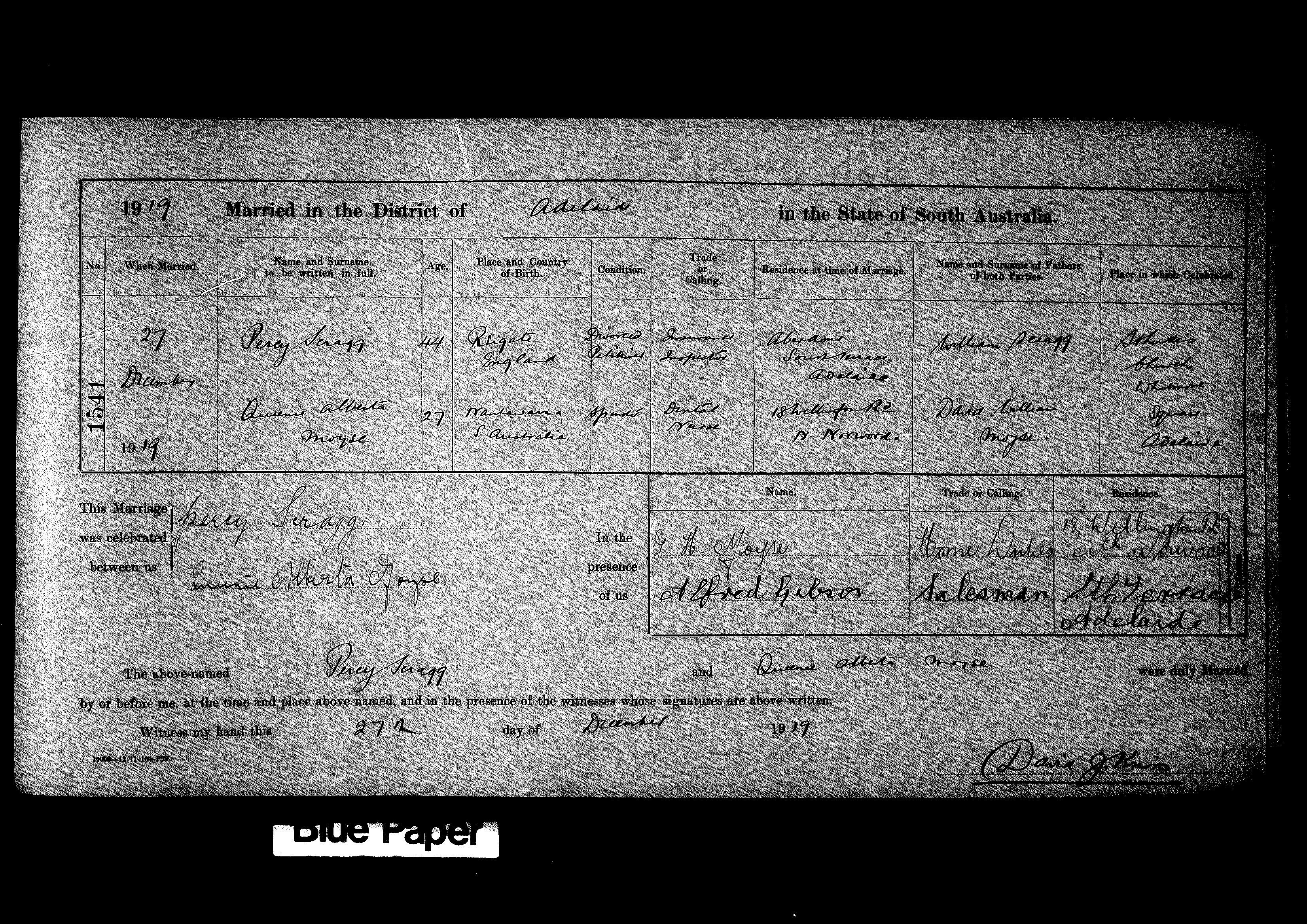 1919 SA Marriage 281/1106 SCRAGG Percy MOYSE Queenie Alberta, Adelaide; Bride: 27y S, Groom: 44y D.