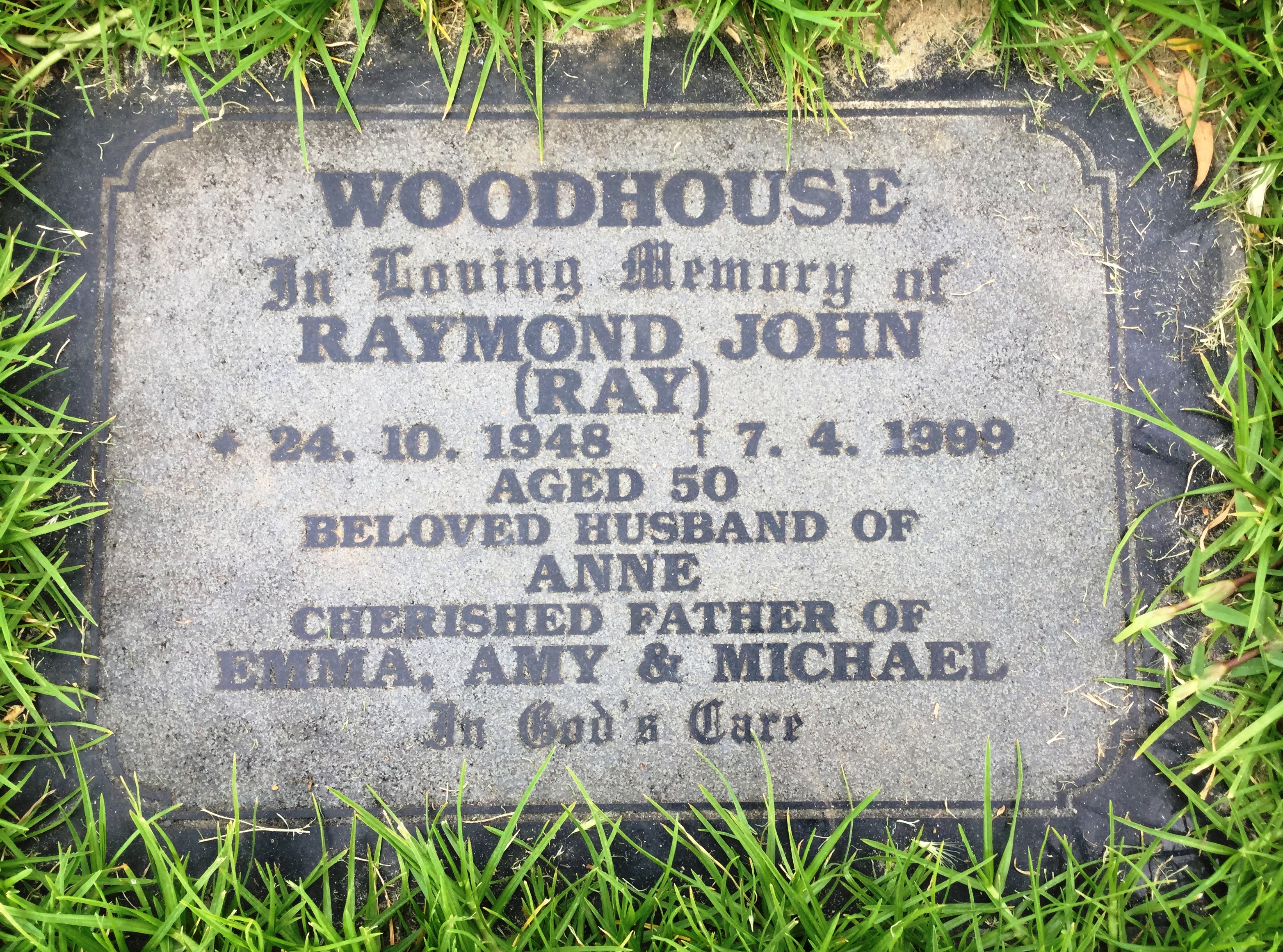 The Adelaide Advertiser Saturday 10 Apr 1999 Death Notices: WOODHOUSE, Raymond John. - Passed away suddenly on April 7, 1999. Aged 50 years. Most dearly loved and precious husband and father of Anne, Emma (deceased) Amy and Michael. Re-uniting with Emma and his adored dad. All resting peacefully in God's Arms. Great missed, but forever in our hearts, a light has gone from our lives.