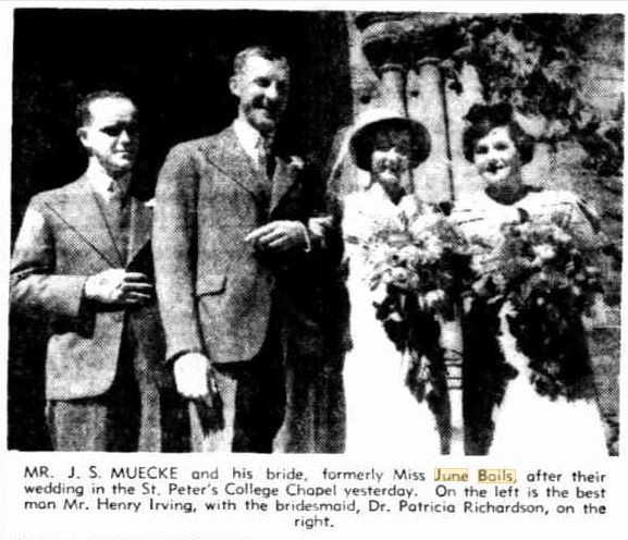 The Advertiser (Adelaide, SA : 1931 - 1954) Fri 18 Feb 1938 MR. J. S. MUECKE and his bride, formerly Miss June Bails, after their wedding in the St. Peter's College Chapel yesterday. On the left is the best man Mr. Henry Irving, with the bridesmaid, Dr. Patricia Richardson, on the right. (Photograph)