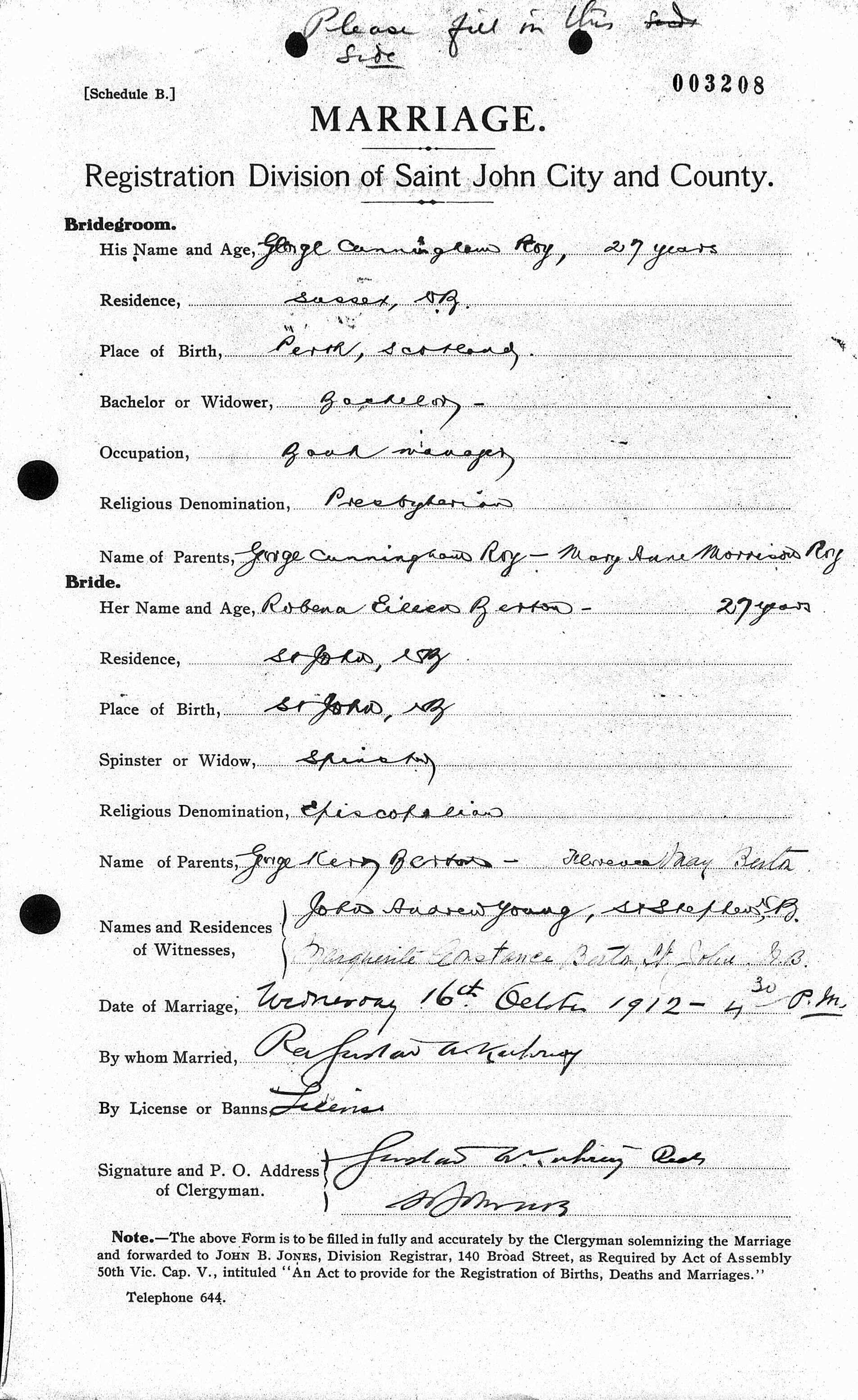 • Census: Canada, 1921, Church Ave, Sussex Town, New Brunswick, Canada. Robena is recorded as wife age 36 born New Brunswick and described as Banker; the family home is Rented built of wood and classed as Single House. Robena married George Cunningham ROY [638] [MRIN: 1390], son of George Cunningham ROY [636] and Mary Ann "Annie" MORISON [634], on 16 Oct 1912 in New Brunswick, Canada. (George Cunningham ROY [638] was born in 1885 in Perth, Perthshire, SCT, died on 5 Jan 1928 in St John, New Brunswick, Canada and was buried on 8 Jan 1928 in Fernhill Cemetery,.). The cause of his death was Lobal Pneumonia. |