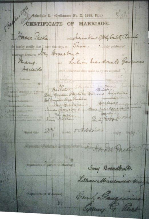• Marriage: Certificate, 1899, (photograph of film taken at Suva Archives Fiji 2015). Transcription of Marriage Certificate: Schedule D. - (Ordinance No. X. 1892, Fiji) CERTIFICATE OF MARRIAGE. I, Horace Packe being Incumbent of the Holy Trinity Church do hereby certify that I have this day, at Suva, duly celebrated marriage between Ivey Broadbent of Penang and Lilian Macdonald Gasquoine of Adelaide after declaration duly made as by law required Particulars . . . . Bridegroom . . . . Bride Age: . . . . 30 . . . . 25 Condition (Bachelor or Widower) (Spinster or Widow): . . . . Bachelor . . . . Spinster Birthplace: . . . . Cherry Gardens, S.Australia; . . . . Norwood Adelaide Rank or Profession: . . . . Asst Manager, Sugar Plantation; . . . . -- Usual Place of Residence: . . . . Penang (Fiji); . . . . Adelaide Father's name (in full): . . . . James Broadbent; . . . . Henry Macdonald Gasquoine Father's profession: . . . . Farmer; . . . . Traveller Mother's maiden name (in full): . . . . Mary Hoskin; . . . . Emily Wood Dated this 2nd day of October 1899. (Signature of Minister or Registrar-General): . . . . Horace Packe, Priest (Signature of parties to Marriage): . . . . Ivey Broadbent . . . . Lillian Macdonald Gasquoine (Signature of Witness): . . . . Emily Gasquoine . . . . Septimus G Sturt