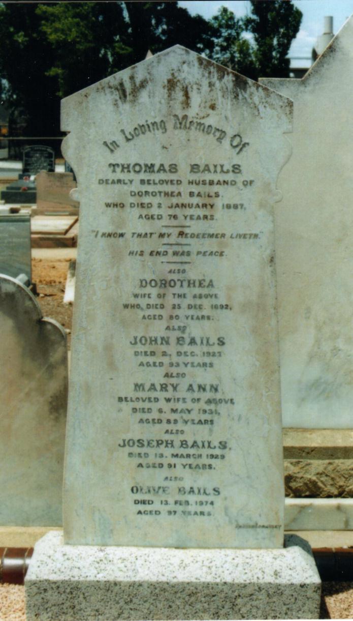 Bails Family Headstone 1887 Cheltenham Cemetery: Thomas d.1887; Dorothea d.1892; John d.1927; Mary Ann d.1931; Joseph d.1929; Olive d.1974