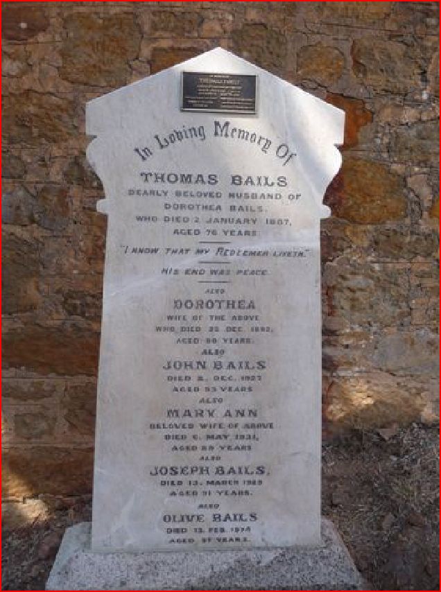 • Old Bails Headstone: ex Cheltenham Cemetery, 2011, Uniting Church Cherry Gardens, South Australia. Thomas d.1887; Dorothea d.1892; John d.1927; Mary Ann d.1931; Joseph d.1929; Olive d.1974 - (This headstone was originally at Cheltenham Cemetery. When permission was sought and granted for removal, the headstone was found in pieces. Thanks to Lance Bails' mammoth task to rebuild and relocate to Cherry Gardens Uniting Church. A commemorative plaque is attached for posterity.)