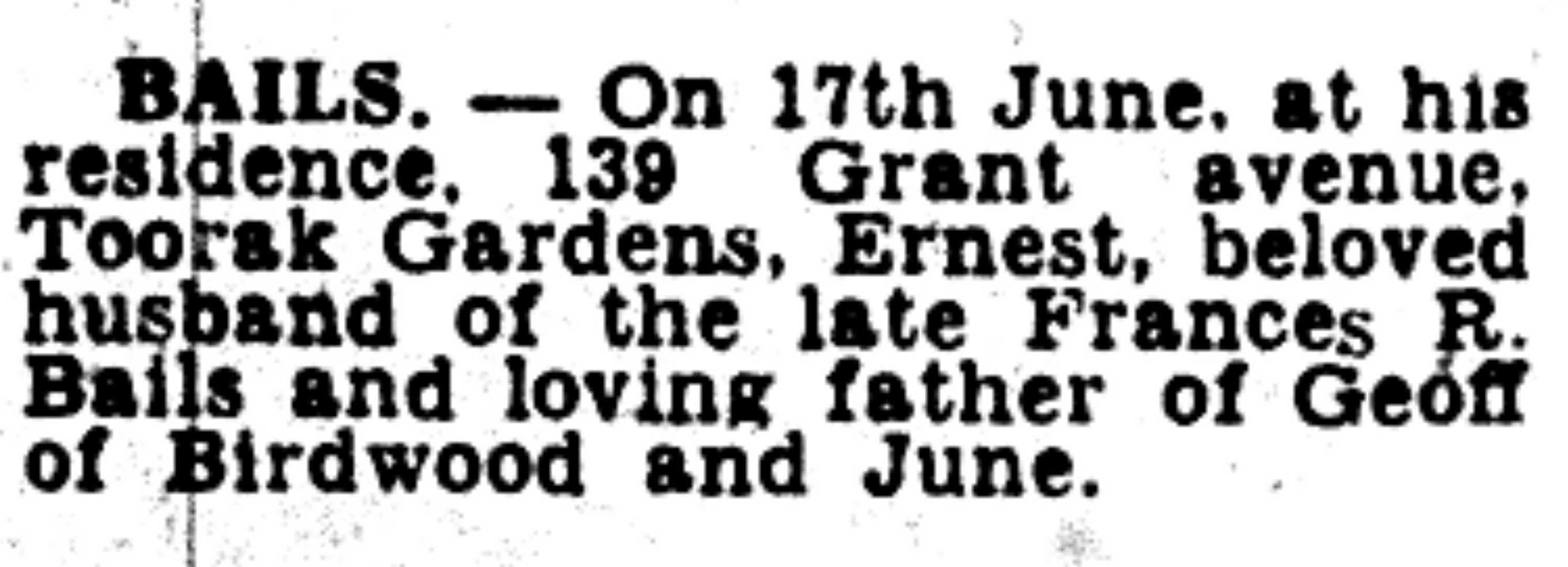 ![]() • Ernest Bails: Death Notice, 1955, Toorak Gardens, Adelaide, South Australia. ![]() Ernest married Frances Regarlsford PALMER [3863] [MRIN: 1288], daughter of Living and Anne Emma SMEDLEY [12568], on 8 Dec 1906 in St Marys Church, West Perth, Western Australia. (Frances Regarlsford PALMER [3863] was born on 1 Sep 1872 in Victor Ville nr Greenock, South Australia, died on 8 Mar 1949 in Joslin, Adelaide, South Australia and was buried on 10 Mar 1949 in Centennial Park Cemetery, Adelaide, South Australia.). The cause of her death was Coronary Occlusion/Arterial Hypertension.