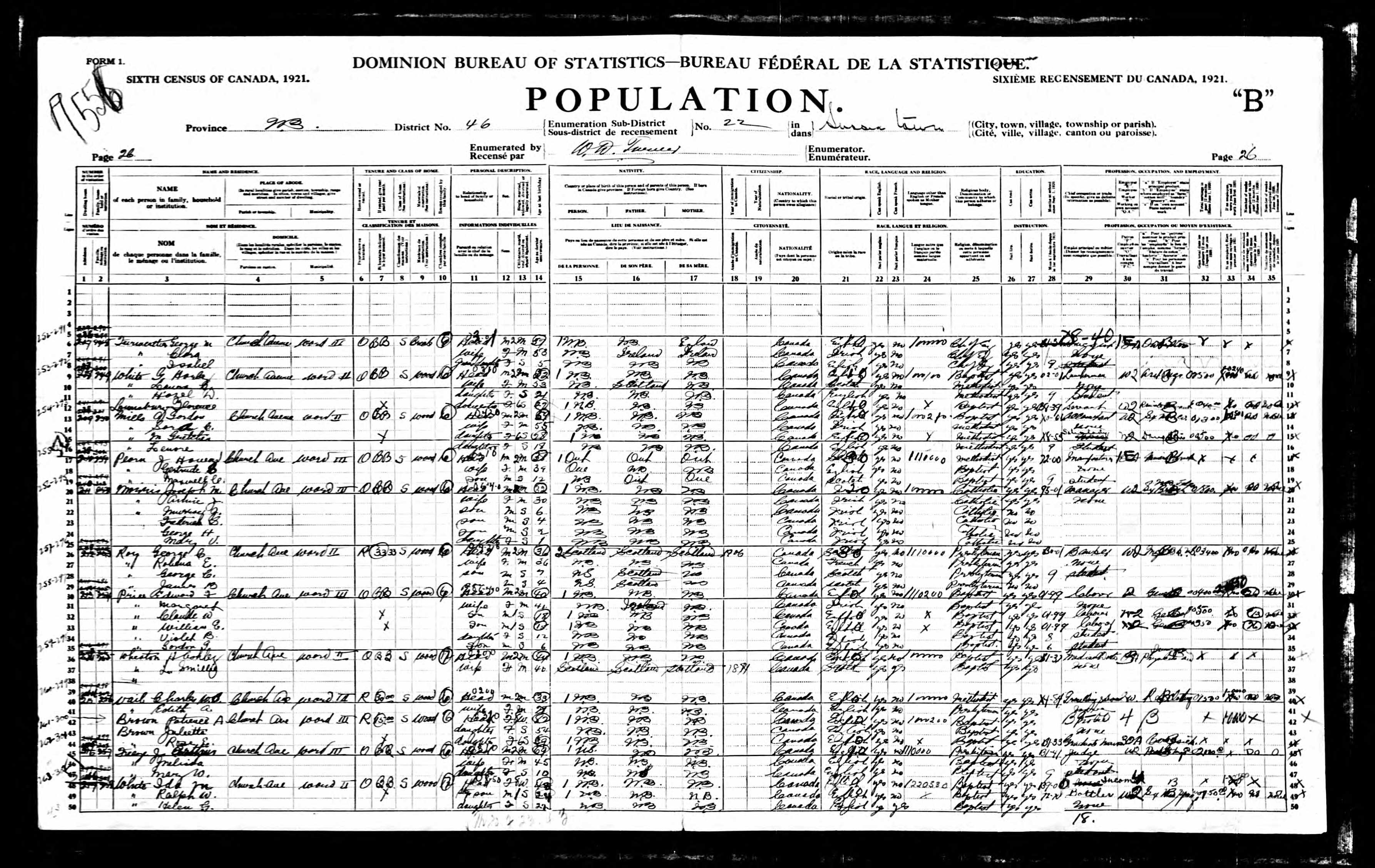 • Census: Canada, 1921, Church Ave, Sussex Town, New Brunswick, Canada. Geo jr. is recorded as son age 7 born New Brunswick and described as Student; the family home is Rented built of wood and classed as Single House.