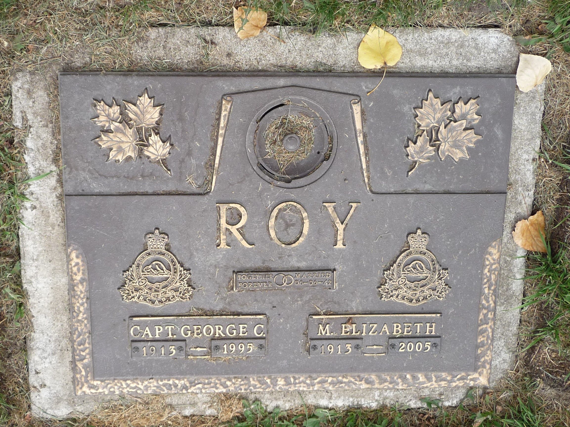 • Capt. George Cunningham ROY: Plaque, 1995, Cemetery: Mountain View Memorial Gardens, Alberta, Canada. George married Mary Elizabeth HAMILTON [18085] [MRIN: 6674], daughter of Living and Living, on 6 Jun 1942 in Trinity Church, Germain st, St John, New Brunswick, Canada. (Mary Elizabeth HAMILTON [18085] was born on 6 Sep 1913 in St John, New Brunswick, Canada and died on 17 Aug 2005 in Calgary, Alberta, Canada.) |