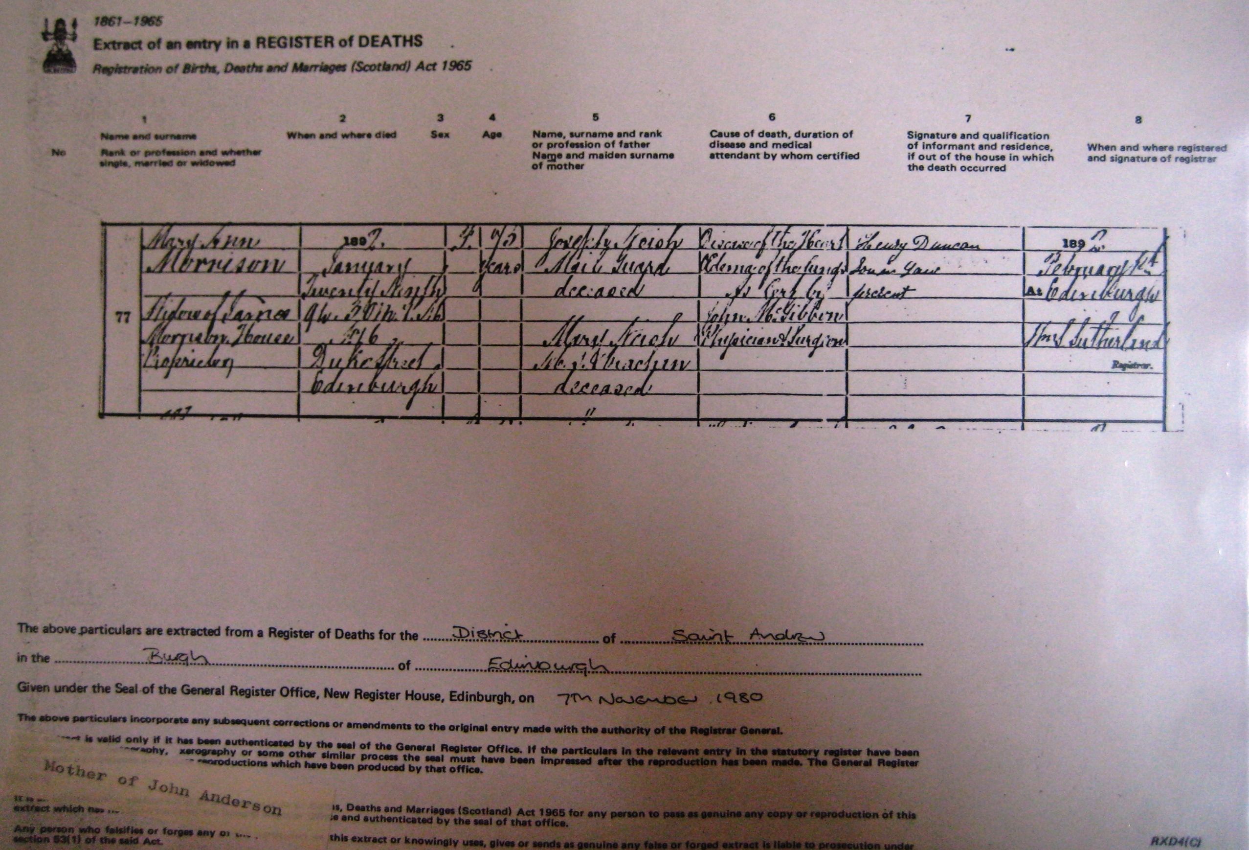 • Census: Scotland, 5 Apr 1891, 16 Duke Street, Edinburgh. Mary A Morrison is recorded as M-inlaw age 75 and living on Private Means