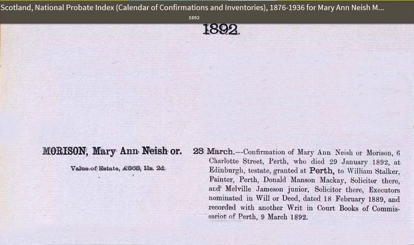 • Scotland Probate: Calendar, 28 Mar 1892, Perth, Scotland. Scotland National Probate Index (Calendar of Confirmations and Inventories) 1876-1936 1892 MORRISON, Mary Ann Neish or. Value of Estate, £868, 11s. 2d. 28 March. - Confirmation of Mary Ann Neish or Morison, 6 Charlotte Street, Perth, who died 29 January 1892, at Edinburgh, testate, granted at Perth, to William Stalker, Painter, Perth, Donald Manson Mackay, Solicitor there, and Melville Jameson junior, Solicitor there, Executors nominated in Will or Deed, dated 18 February 1889, and recorded with another Writ in Court Books of Commissariot of Perth, 9 March 1892.