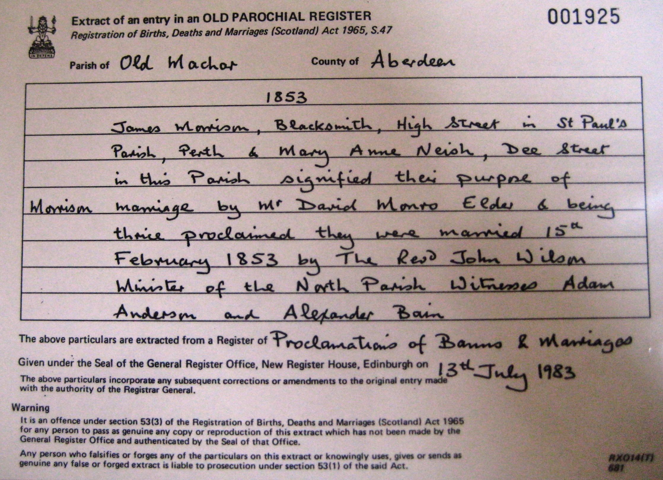Extract of an entry in an Old Parochial Register, Registration of Births, Deaths and Marriages (Scotland) Act 1965 S47 001925 Parish of Old Machar, County of Aberdeen, 1853 James Morrison Blacksmith High Street in St Paul's Parish, Perth & Mary Anne Neish Dee Street in this Parish signified their marriage by Mr David Monro Elder & being thrice proclaimed they were married 15th February 1853 by The Revd John Wilson Minister of the North Parish. Witnesses: Adam Anderson and Alexander Bain.