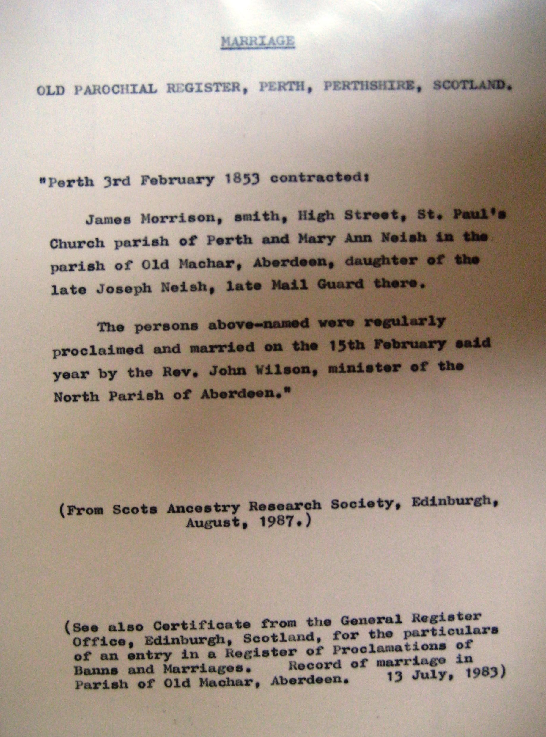 MARRIAGE Old Parochial Register, Perth, Perthshire, Scotland "Perth 3rd February 1853 contracted: James Morrison, smith, High Street, St. Paul's Church parish of Perth and Mary Ann Neish in the parish of Old Machar, Aberdeen, daughter of the late Joseph Neish, late Mail Guard there. The persons above-named were regularly proclaimed and married on the 15th February said year by the Rev. John Wilson, minister of the North Parish of Aberdeen." (From Scots Ancestry Research Society, Edinburgh, August, 1987)