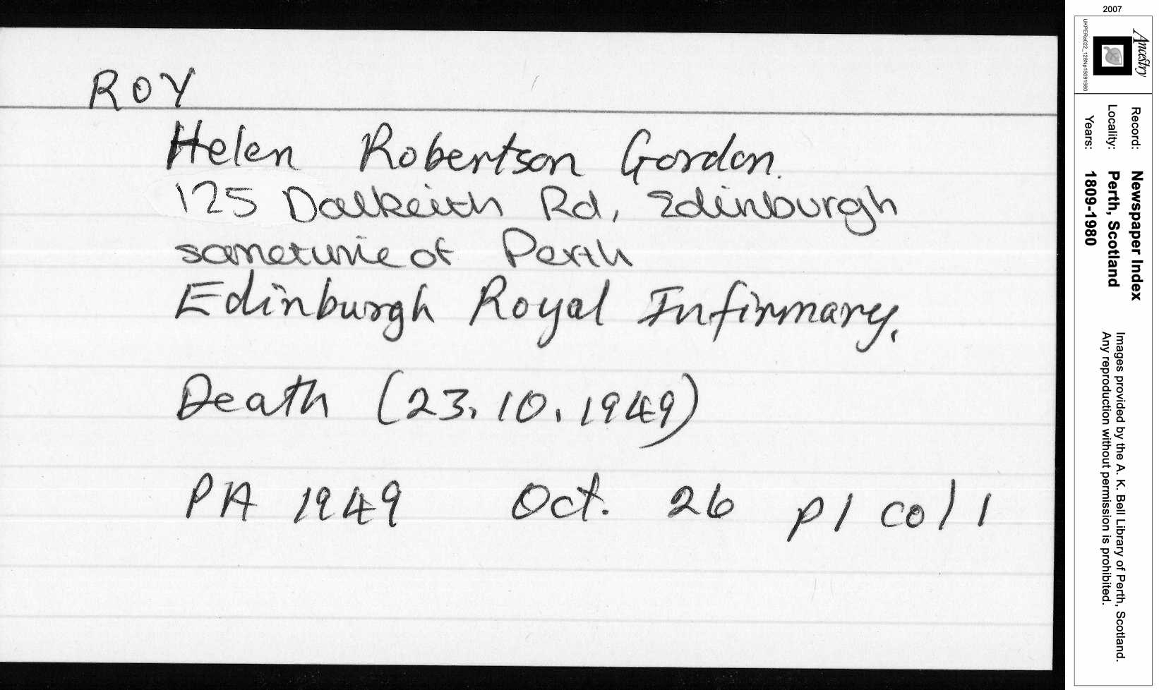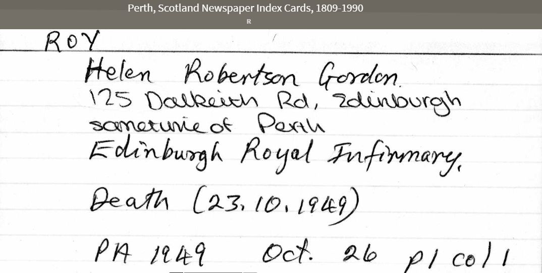 • Perth Scotland Newspaper: Card, 1949, Royal Edinburgh Infirmary. (Image Courtesy Ancestry) Helen married George Cunningham ROY [636] [MRIN: 220], son of James ROY [2294] and Mary SCOTT [2866], in 1892 in Perthshire, Scotland. (George Cunningham ROY [636] was born on 25 Nov 1848 in Methven, Perthshire, Scotland, baptised on 10 Dec 1848 in Methven, Perthshire, Scotland, died on 17 Oct 1907 and was buried in 1907 in Welshill Cemetery, Perth, Scotland.) |