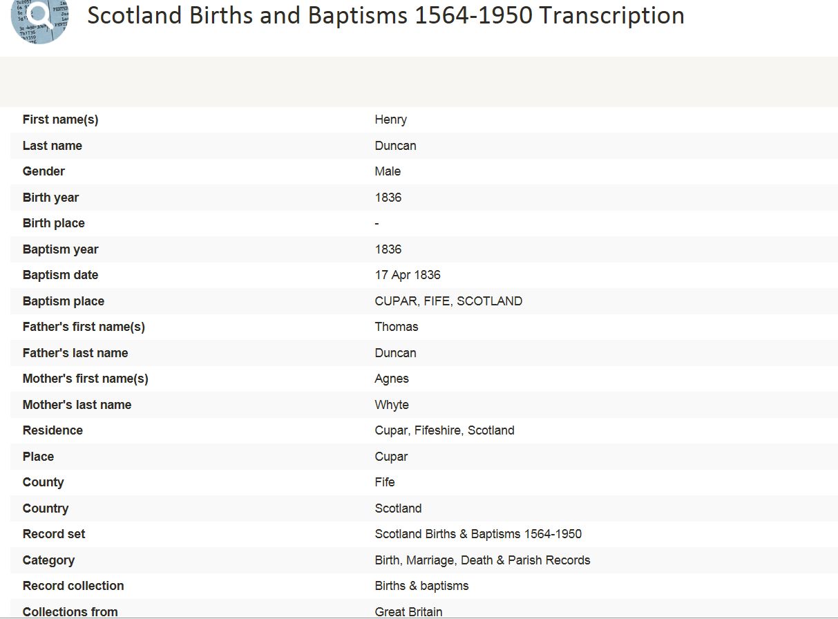 • Occupation: Joiner. • Census: Scotland, 7 Jun 1841, Dovecotland, Perth, Pershire. Henry is described as Male age 5 born abt 1836 in Scotland. • Census: Scotland, 31 Mar 1851, Pittendyrice, Moneydie, Perthshire. Henry is described as Son age 14 Twin Farm Labourer born at Capas, Fifeshire (Capas could be Cupar which is South of Balmerino, Fifeshire). • Census: Scotland, 7 Apr 1861, 7 India Place, Edinburgh St Cuthberts, Midlothian. Henry is described as Boarder age 24 born abt 1837 Balmerino, Fifeshire. Henry is boarding with Robert Duncan and his wife Catherine Duncan both age 36 (could be related not sure how - may be older brother?). • Census: Scotland, 2Apr 1871, 9 Greenside Place, Edinburgh, Scotland. Henry is recorded as Head age 33y born abt 1838 and described as House Joiner Master • Census: Scotland, 3 Apr 1881, 3 Caledonian Crescent, Midlothian, Edinburgh. Henry is recorded as Head born abt 1838 age 43 and described as Joiner. A Lodger David Sharp age 23 born Auchterarder and described as a Mason. • Census: Scotland, 5 Apr 1891, 16 Duke Street, Edinburgh. Henry is recorded as Head age 53y born Cupar, Fife and described as Joiner. • Census: Scotland, 31 Mar 1901, 10 Elder Street, Edinburgh. Henry is recorded as Head age 62y born abt 1839 and recorded as Joiner (carpenter) Henry married Elizabeth STEPHEN [630] [MRIN: 222], daughter of William STEPHEN [642] and Mary Ann NEISH [629], on 28 Jun 1861 in Edinburgh, Scotland. (Elizabeth STEPHEN [630] was born on 28 Jun 1838 in Dunbarney, Perthshire, Scotland and died after 1916.)