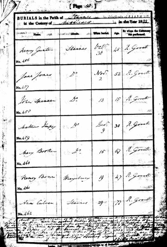 • Henry Gunter Snr: Parish Register, 1822, Staines, Middlesex, England. (Image Courtesy Ancestry: London England Church of England Death and Burials, 1813-1980)